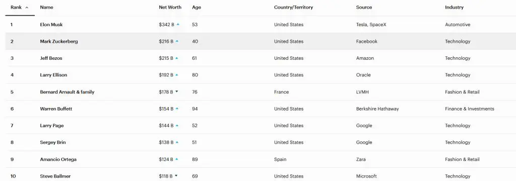 - Elon Musk (સંપત્તિ: $460.4 બિલિયન) ટેસ્લા અને સ્પેસએક્સના માલિક એલોન મસ્ક વિશ્વના સૌથી ધનિક વ્યક્તિ છે. તેઓ ટેસ્લામાં 12% અને સ્પેસએક્સમાં 42% હિસ્સો ધરાવે છે.