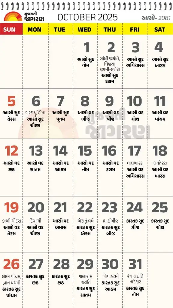 દિવાળી 2025 ગુજરાતી કેલેન્ડર (Diwali 2025 Gujarati Calendar)