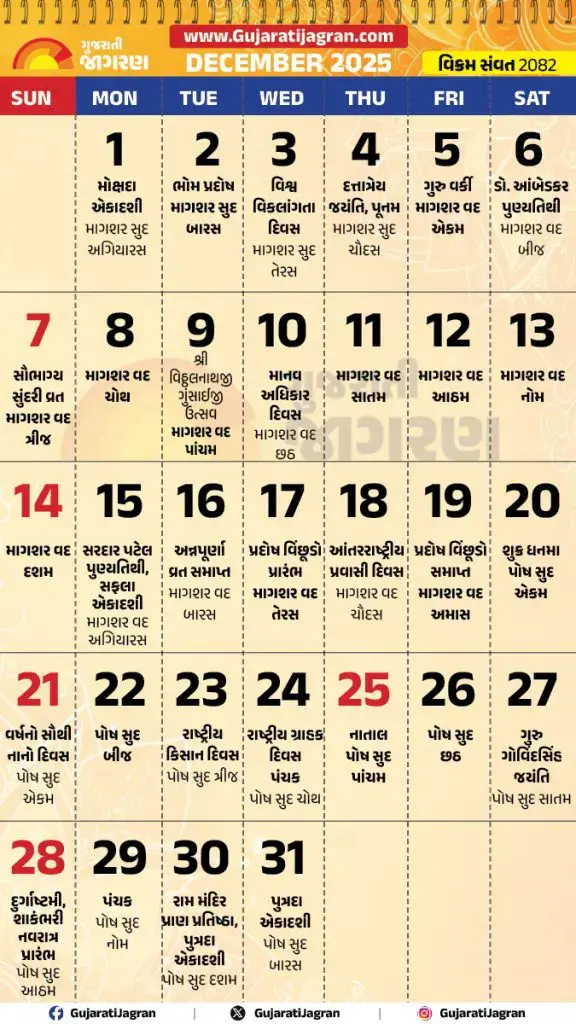 Gujarati Calendar 2025 December (ગુજરાતી કેલેન્ડર 2025 ડિસેમ્બર): વર્ષ 2025 નો અંતિમ મહિનો ડિસેમ્બર નજીક છે. હિન્દુ પંચાંગ અનુસાર આ મહિનો ધાર્મિક અને આધ્યાત્મિક દ્રષ્ટિએ અત્યંત મહત્વપૂર્ણ માનવામાં આવે છે. ડિસેમ્બર મહિનામાં ગીતા જયંતિ, મોક્ષદા એકાદશી, દત્ત જયંતિ અને ધનુ સંક્રાંતિ જેવા અનેક પવિત્ર તહેવારો અને વ્રત આવી રહ્યા છે. ચાલો જાણીએ ડિસેમ્બર 2025 ના મુખ્ય તહેવારો અને તેનું મહત્વ.